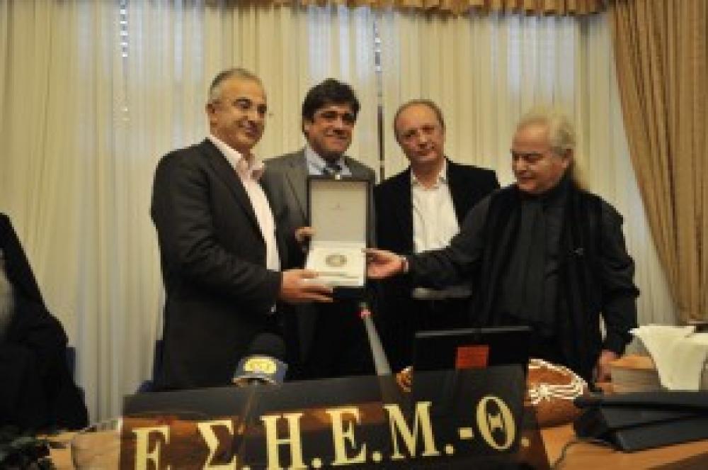 Το βραβείο απένειμε στον Νίκο Ασλανίδη ο Γενικός Γραμματέας του ΔΣ του Ιδρύματος, Ηλίας Κουτσούκος, χτες, κατά τη διάρκεια της ετήσιας γιορτής της ΕΣΗΕΜ-Θ.